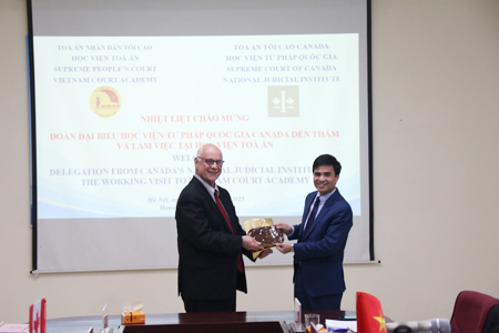 Đoàn Đại biểu Học viện Tư pháp quốc gia Canada có Ông Tom Crabtree, Thẩm phán Tòa án tối cao, Giám đốc Ban Quản trị tư pháp, Học viện Tư pháp quốc gia Canada; Bà Danielle May-Cuconato, Giám đốc điều hành Học viện Tư pháp quốc gia Canada; Bà Pamela Tripp, Giám đốc Hợp tác quốc tế Học viện Tư pháp quốc gia Canada; Bà Geeta Gera, Trưởng phòng Kế hoạch và phát triển Học viện Tư pháp quốc gia Canada và Ông Nguyễn Trí Dũng – Đại diện/Liên lạc tại Việt Nam của Học viện Tư pháp quốc gia Canada.